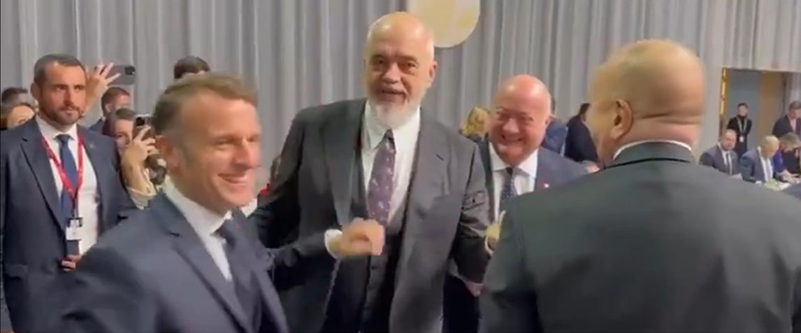 Albaniens premiärminister Edi Rama filmades när han skämtade med Frankrikes president Emmanuel Macron och Azerbajdzjans president Ilham Aliyev.